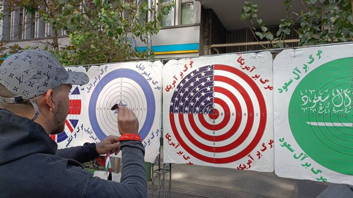 راهپیمایان شمایل کاریکاتوری سران استکباری که در سال های گذشته رفتارها و مواضع ضدایرانی داشته اند، در دست گرفته اند که از جمله می توان به آدمک امانوئل ماکرون رئیس جمهور فرانسه اشاره کرد.